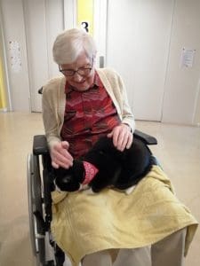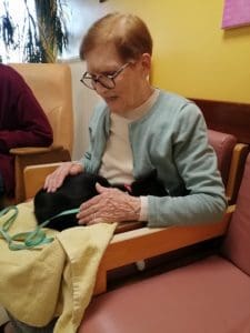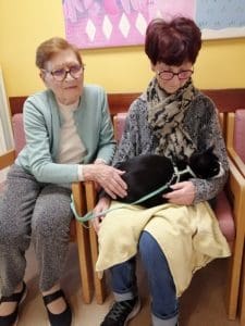 Voici un nouveau compagnon pour nos visites de médiation animale. Aska, un chien très doux et calme qui fait connaissance avec nos résidents.